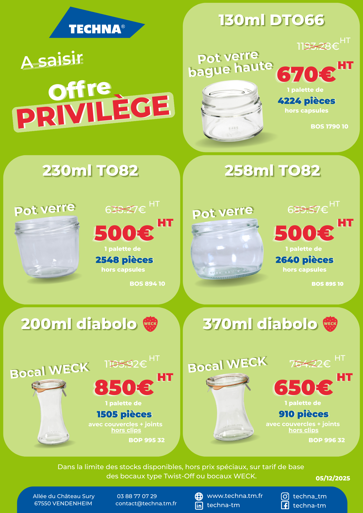 TECHNA propose une gamme diversifiée et complémentaire de solutions de conservation alimentaire, visant à répondre efficacement aux besoins de ses clients en stérilisation, pasteurisation, mise sous vide, fermeture et remplissage de bocaux en verre, etc. Nous offrons des solutions adaptées en fonction de chaque besoin, incluant des stérilisateurs autoclaves, des bocaux de conservation WECK, des bocaux de type Twist-Off, des machines sous vide, des sacs sous vide, ainsi que des accessoires pour bocaux (couvercles en verre, joints en caoutchouc, clips…) et pour stérilisateurs autoclaves. Avec TECHNA, vous disposez du nécessaire pour optimiser votre processus de conservation.